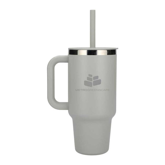 Powder coated 40oz stainless steel tumbler with double-wall insulation. It features an ergonomic handle and flexible straw.