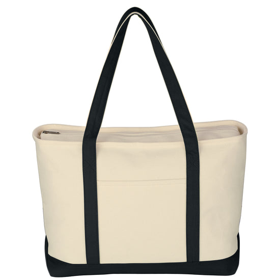This tote is made from 24oz cotton canvas and features a top zipper closure.