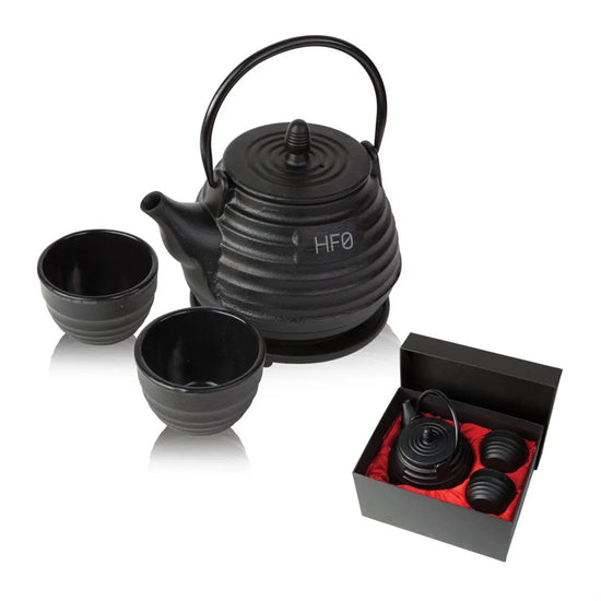 This set includes two cast iron tea cups, cast iron teapot, stand and stainless steel loose leaf tea filter.